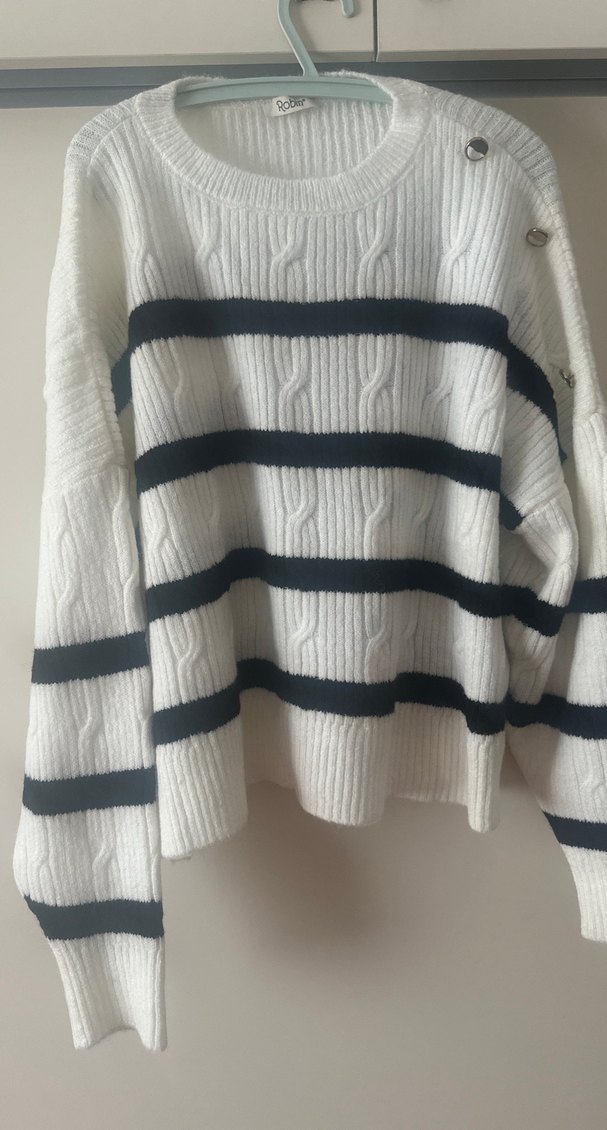 Bu rahat kadın kazak, uzun kollu ve yuvarlak yakalıdır. Yumuşak örgü kumaştan yapılmış, siyah yatay çizgiler ve bol kesimiyle günlük sokak tarzına uygundur. Beden Oversiz dır sol omuzda düğme detayı vardır