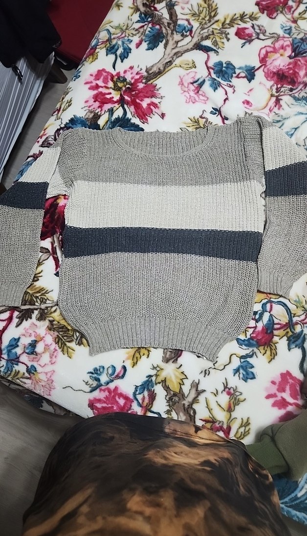 Gri, çizgili örgü kadın kazak, uzun kollu ve kayık yaka tasarımıyla rahat, kısa kesimdir. Sokak stili ve günlük kullanım için uygundur. dar geldiği için satılıktır. temiz çok fazla giyilmedi alacak olan pişman olmaz şimdiden güle güle kullanılsın.