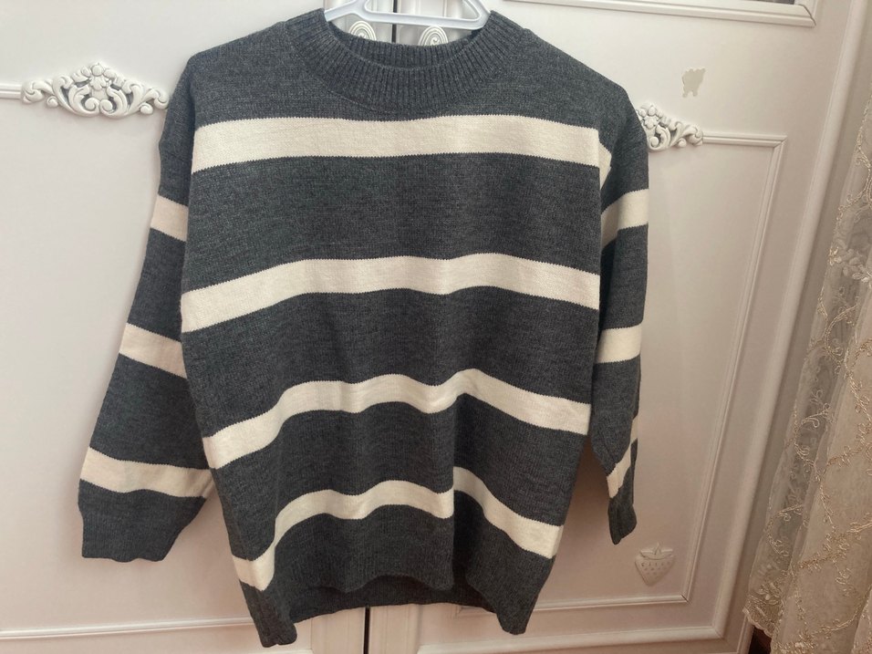 Gri renkli, örgü yapıda, yumuşak yünden yapılmış, uzun kollu ve yuvarlak yaka kazak. Salaş kesimi ve çizgili deseniyle günlük rahat kullanım için uygundur. S ve m beden için uygundur etiketi yok ama giymedim hiç