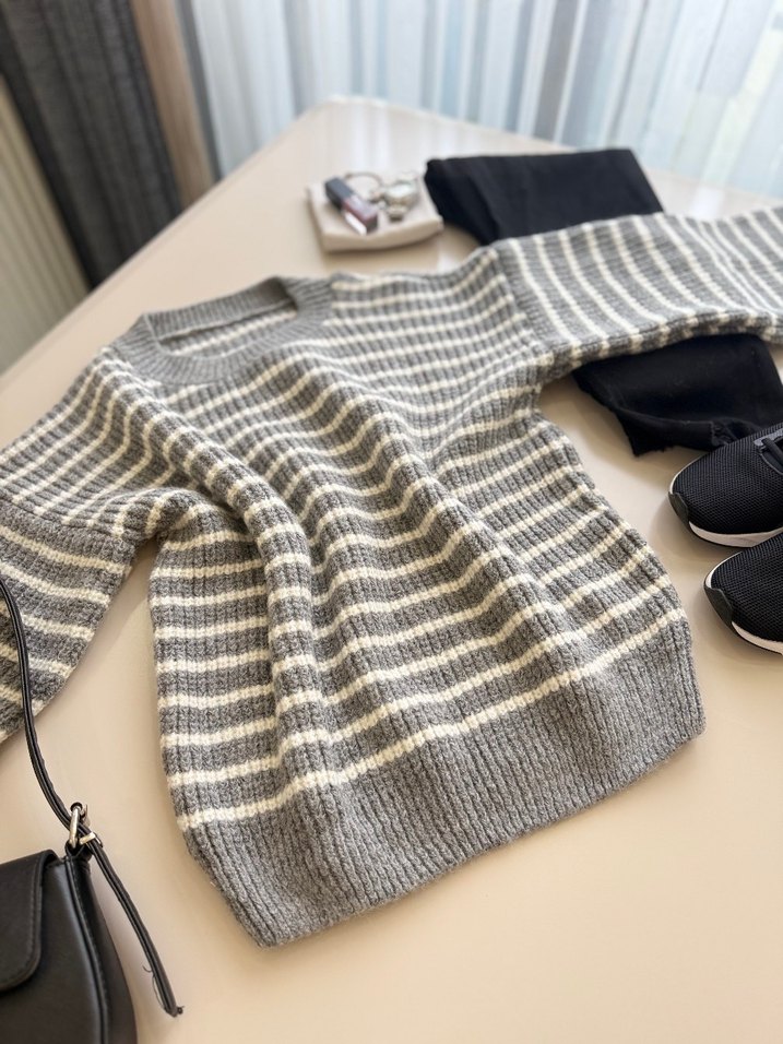 Gri tonlarında çizgili örgü kadın kazak, uzun kollu ve yuvarlak yaka. Rahat kesimi ve midi boyu ile gündelik sokak stiline uygundur.