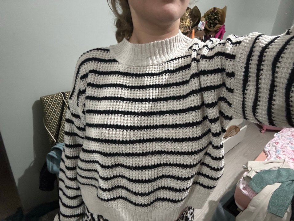 Gri renkli, çizgili örgü kadın kazak, uzun kollu ve yuvarlak yakalıdır. Salaş kesimi ve midi boyu ile rahat bir sokak stili sunar.