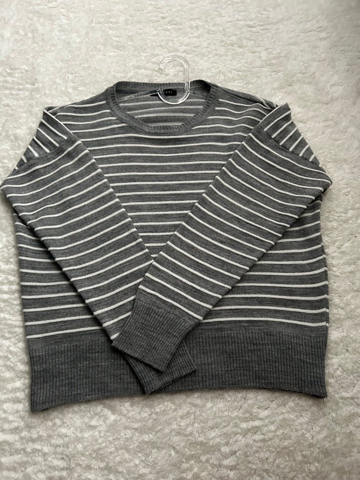 Gri renkli, çizgili örgü yünden yapılmış bu kadın kazak, yuvarlak yaka, uzun kollu Standart bedendir. Defosu yoktur.
