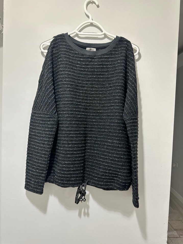 Gri renkli, uzun kollu ve yuvarlak yakalı örgü kazak. Çizgili deseni ve bol kesimiyle rahat ve şık bir günlük tercih.
