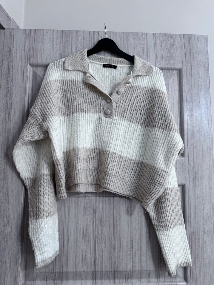 Geniş kesim, uzun kollu ve yakalı gri ve krem çizgili örgü kadın kazak, rahat sokak stili ve günlük kullanım için uygun.