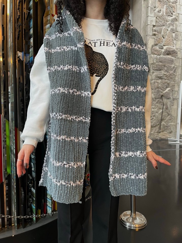 Gri çizgili, örgü dokulu kadın şal, rahat ve sokak stiline uygun.