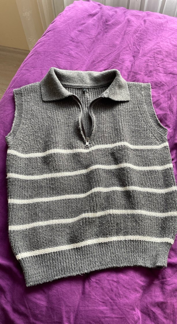 Gri renkli, örgü kumaştan yapılmış, kollu yakalı ve önünde fermuar bulunan süveter. Beyaz yatay çizgiler ve rahat kesimiyle günlük sokak stiline uygundur.