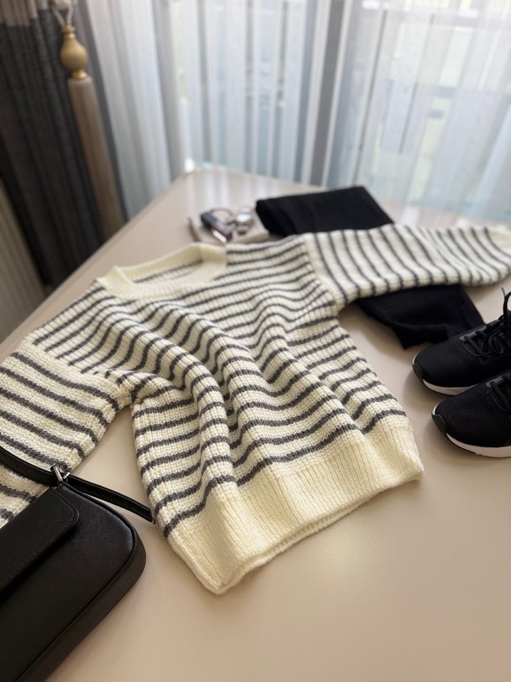 Gri ve beyaz çizgili, gevşek kesim, yuvarlak yakalı örgü kadın triko. Normal midi boyda, rahat sokak stiline uygun.