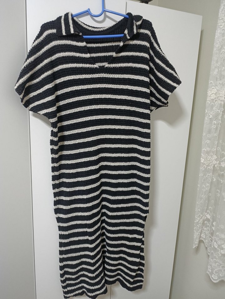 Gri çizgili örgü midi elbise, kısa kollu ve kayık yaka detaylarıyla rahat ve bol kesim sunar. Günlük kullanıma uygundur.