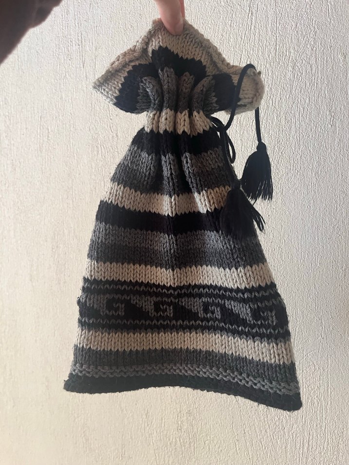 Gri tonlarda yatay çizgili, yumuşak örgü dokulu ve püsküllü ipli yün beredir. Sayılı kullanılmıştır. Temizdir.