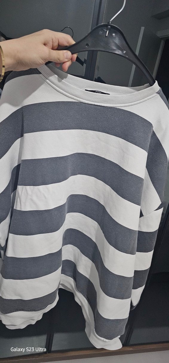 Geniş kesim, yuvarlak yaka ve uzun kollu kadın sweatshirtü. Geniş gri ve beyaz çizgiler ve pamuklu yumuşak kumaş içerir. Rahat kullanım için uygundur.