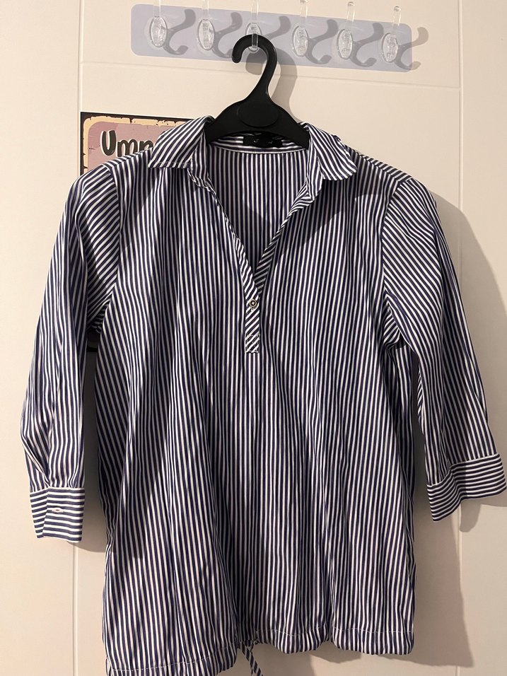 Gri tonlarda çizgili desenli, pamuklu kumaştan, düğmeli, yakalı, uzun kollu, bol kesim gömlek. Ofis için uygundur.