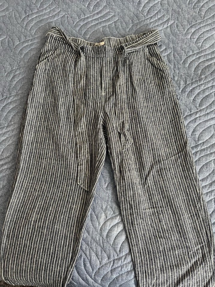 Yumuşak keten kumaştan, çizgili desenli, kemerli, bol kesim midi uzunlukta kadın pantolon. Günlük kullanıma uygun rahat sokak stili.