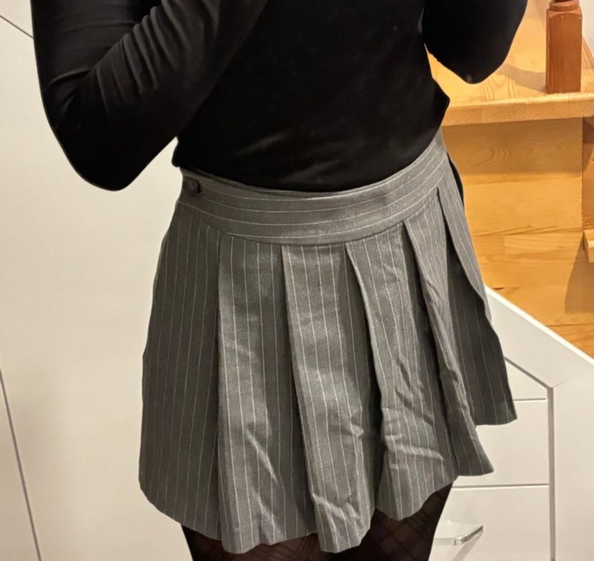 Gri çizgili pileli, normal boy midi mini etek. Sentetik kumaştan, ofis için uygun, şık ve gotik Paris tarzında.