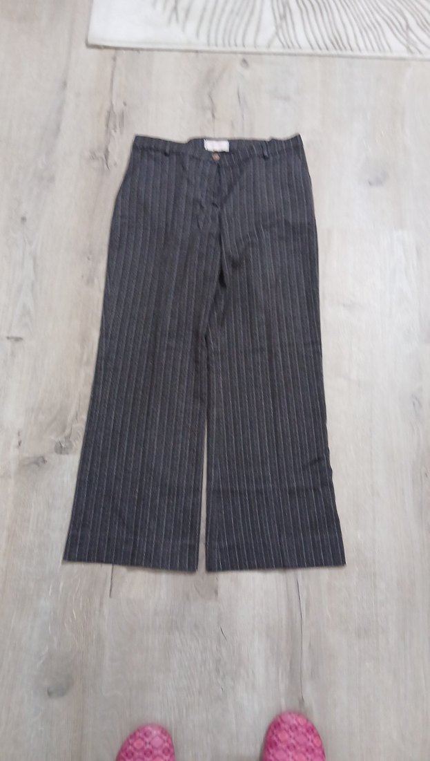 Gri renkli, çizgili desenli, pilili ve midi boy regular fit kadın denim pantolon, ofis için uygun şık ve rahat bir seçenek sunar.