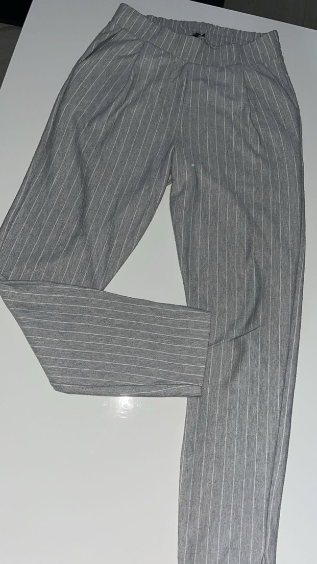 Gri çizgili, pilili kadın kumaş pantolon. Normal kesim ve midi boyda, ofis ve günlük sokak stiline uygun, yumuşak sentetik kumaştan üretilmiştir.