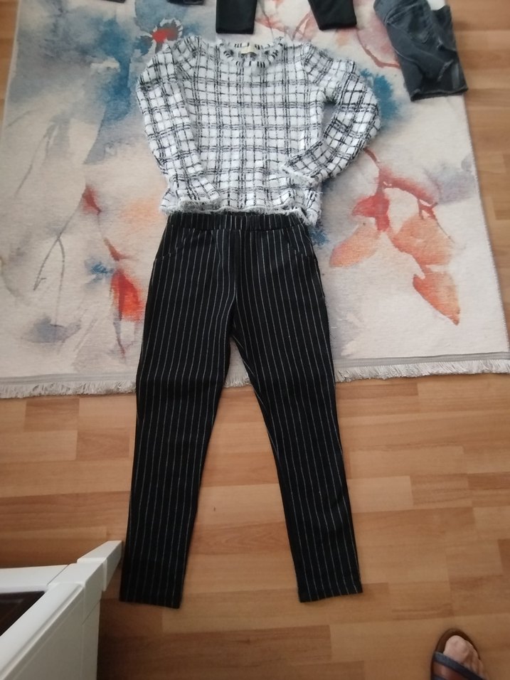 Gri renkli, çizgili ve pilili kadın kumaş pantolon, midi boy ve regular fit tasarıma sahiptir. Günlük rahatlık için sentetik kumaştan üretilmiştir.