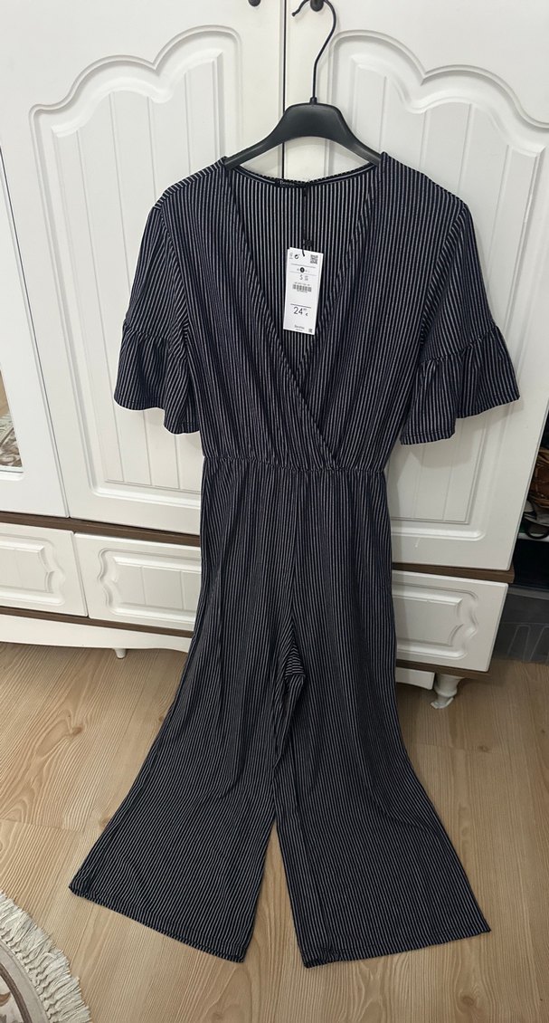 Bu kadın tulumu, piliseli detaylar ve V yaka ile bol kesimdir. Kısa kollu, çizgili gri tasarıma sahip, yumuşak sentetik kumaştan yapılmıştır. Bilek modeldir.