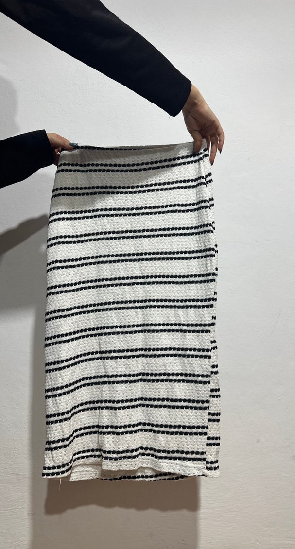 Bu piliseli eteği, beyaz kumaş üzerinde gri çizgili desene sahiptir. Uzun boyu ve minimalist bohem tarzıyla günlük kullanıma uygundur.