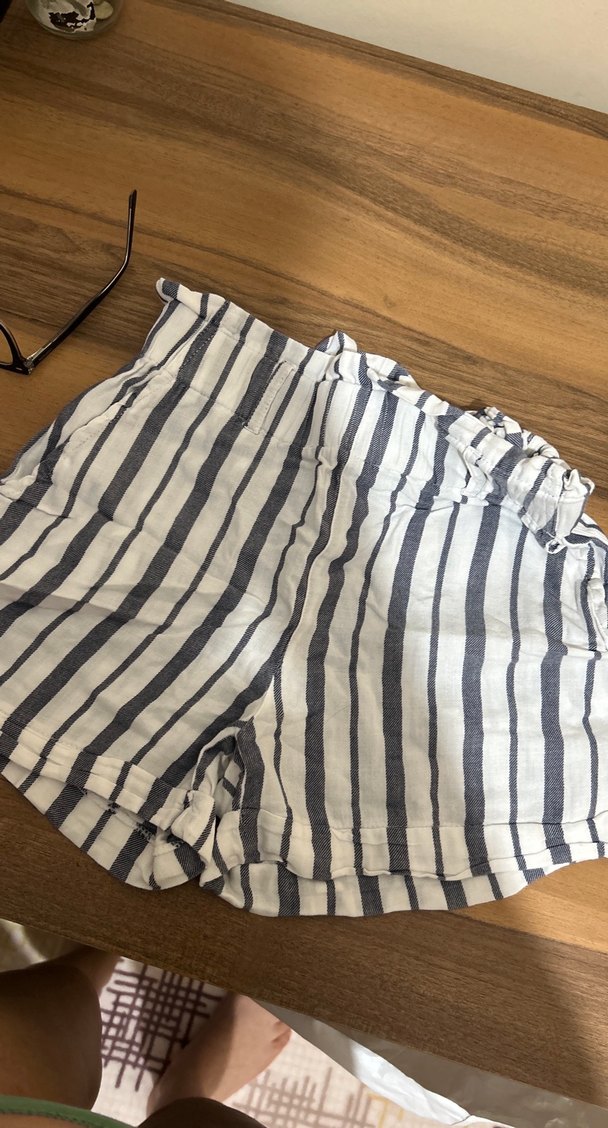 Yumuşak keten kumaştan, bol kesim, gri çizgili ve pliseli detaylara sahip hamile şortu. Günlük kullanım için uygundur.
