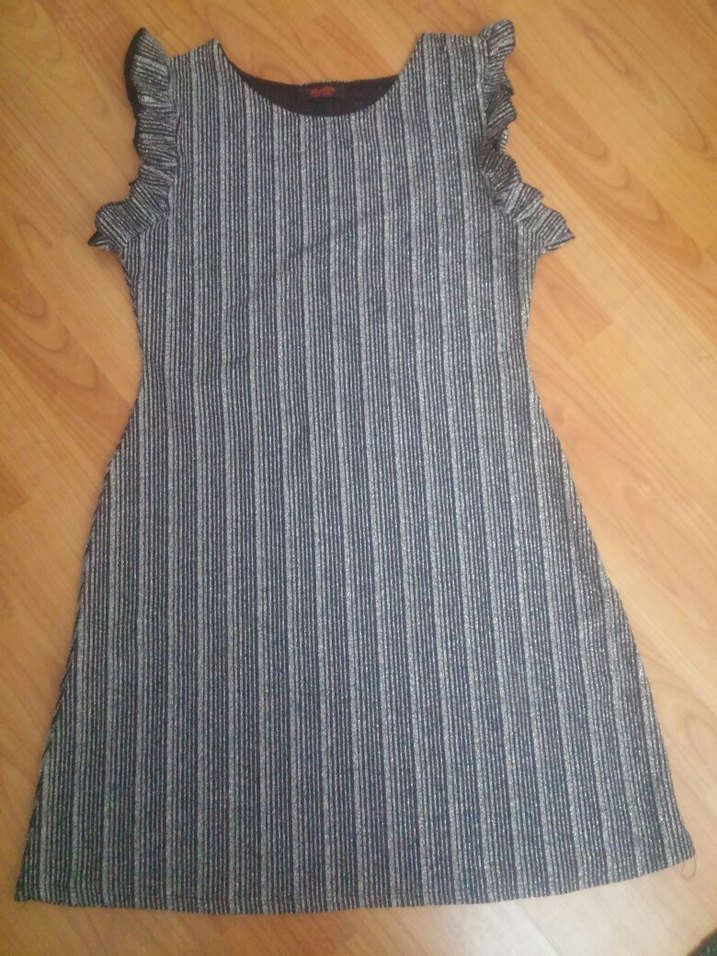 Gri çizgili, pliseli midi triko elbise, kayık yaka ve ince askılı kollara sahiptir. Yumuşak sentetik kumaştan yapılmıştır, rahat ve üzeri simli şık bir görünüm sunar.