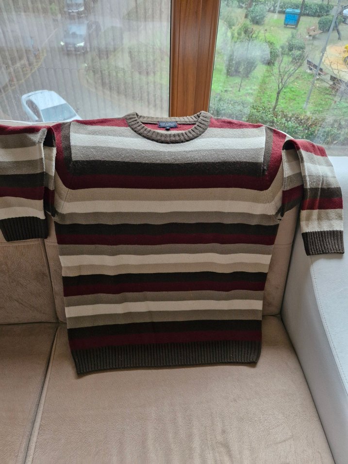 Yuvarlak yaka ve uzun kollu erkek kazak, yumuşak örgü kumaştan, bol kesim. Gri ve bordo çizgili desene sahip, günlük kullanıma uygun. ölçüleri kazak boyu 68 santim en koltuk altından 55 santim bel kısmı 53 santim kol evi genişliği 24 santim kol boyu uzunluğu 61 santim