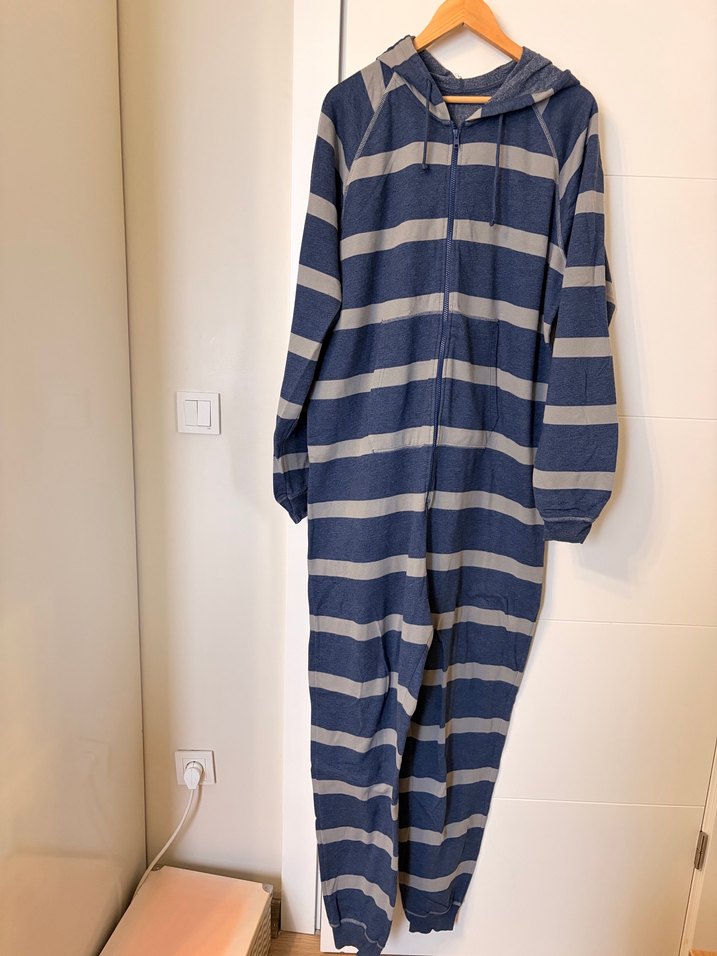 Uzun kollu, fermuarlı ve bol kesim gri çizgili hamile tulumu. Yumuşak ve sıcak kumaştan, günlük rahatlık için ideal.