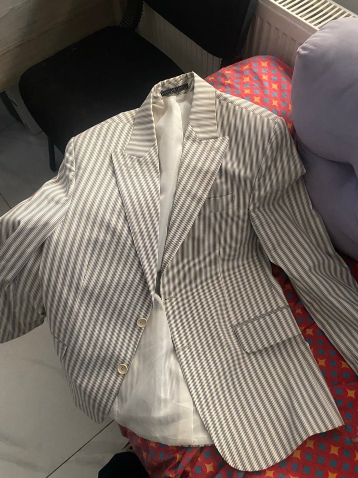 Gri çizgili, regular fit takım ceketi, düğmeli ve uzun kolludur. Notch yaka ile ofis ortamına uygundur.