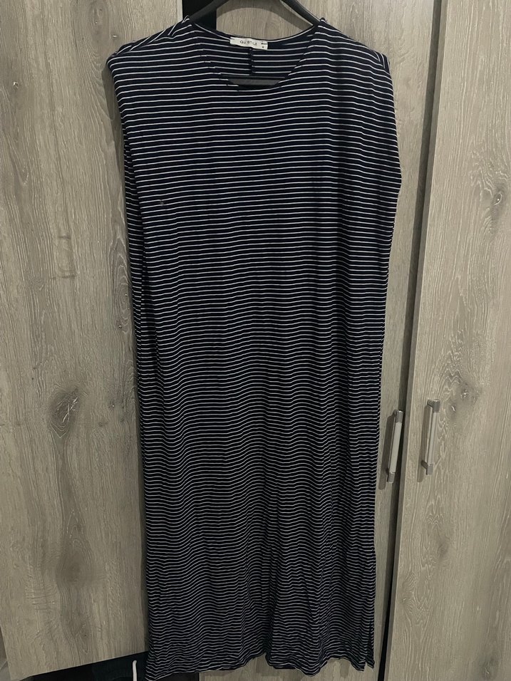 Gri çizgili, salaş kesim uzun örme elbise, drapeli ve kayık yaka detaylıdır. Minimalist ve gündelik normcore stil için uygundur. Hiç giyilmedi