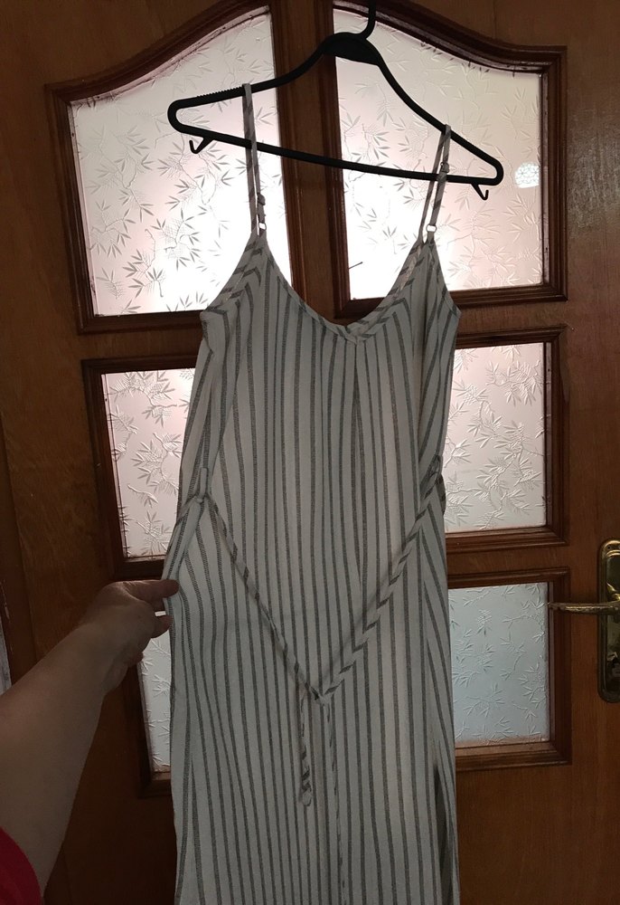 Gri çizgili ince askılı ve V yakalıdır. Keten kumaştan, bol kesimli ve drapeli tasarıma sahiptir, gündelik kullanıma uygundur.