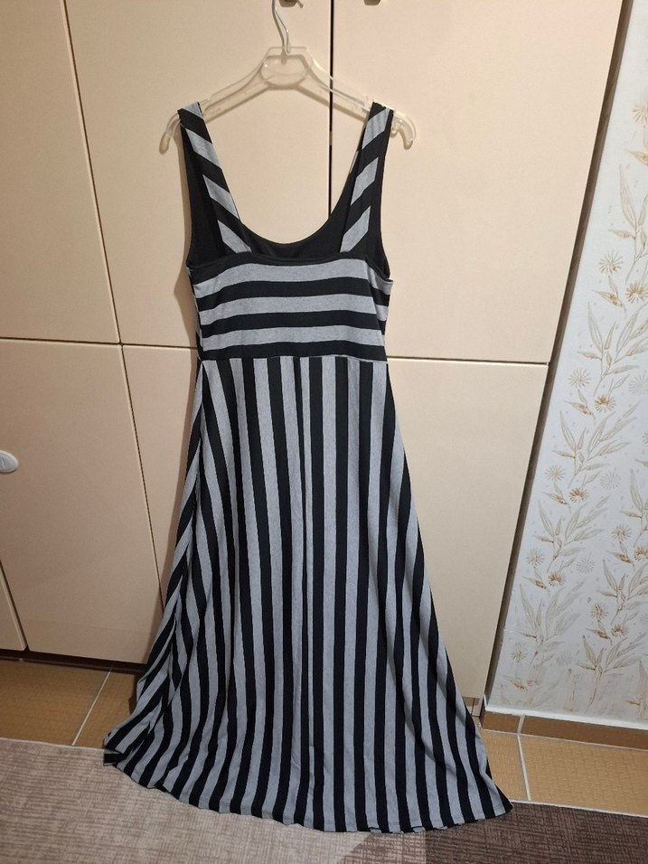 Gri siyah çizgili, tekne yaka ve pileli sentetik kumaştan yapılmış, uzun ve vücuda oturan elbise, gotik ve athleisure tarzlarını günlük kullanım için birleştirir. hiç giyilmedi. boy 120 cm en 36 cm.