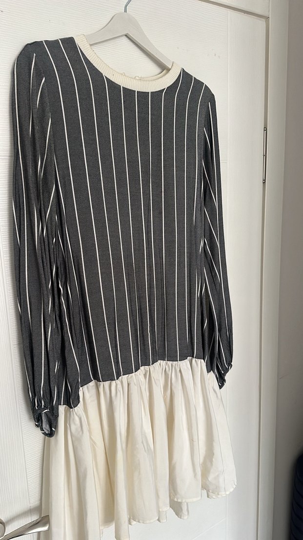 Gri çizgili uzun elbise, keten pileli ve bol kesim etek kısmına sahiptir. Uzun kollu ve yuvarlak yakalı, Paris etkili normcore tarzda günlük kullanıma uygundur.
