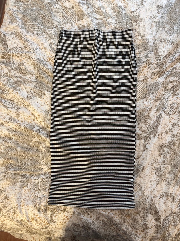 Gri çizgili tekstil kumaştan, ve diz altı uzun kesime sahip, bohem ve avant-garde tarzı yansıtan dar kesim kadın eteği.
