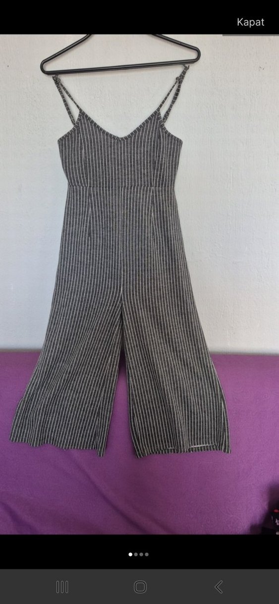 Gri renkte, V yakalı ve ince askılı, çizgili ve pileli detaylı uzun tulum. Rahat kalıplı ve yumuşak sentetik kumaştan, günlük rahat stil için uygun.
