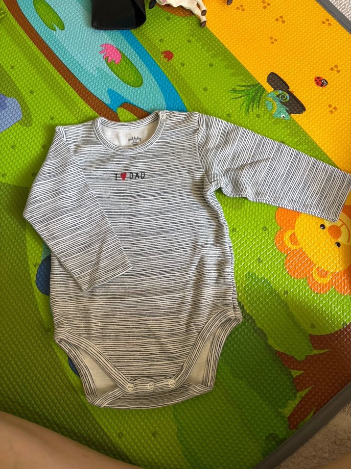 Gri çizgili, uzun kollu, yuvarlak yakalı ve yumuşak pamuklu örme kumaştan yapılmış bebek body. Göğsünde "I ♥ DAD" yazısı bulunur. 2 kez giyildi.