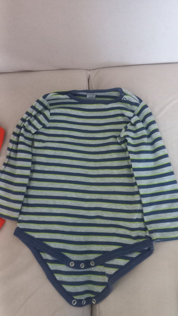 Düğmeli, yuvarlak yakalı, yumuşak örme kumaştan yapılmış gri çizgili uzun kollu bebek body.