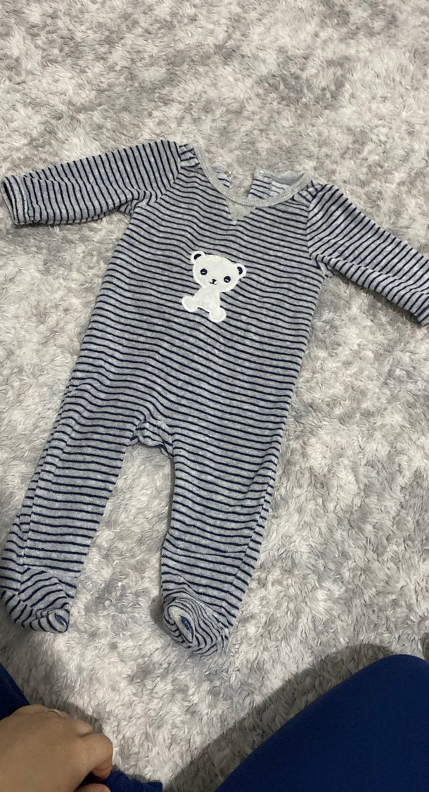 Gri çizgili, uzun kollu, yuvarlak yakalı ve sevimli ayıcık işlemeli yumuşak bebek tulumu. Fransa’dan geldi markasını bilmiyorum hatalarını görselde paylaştım