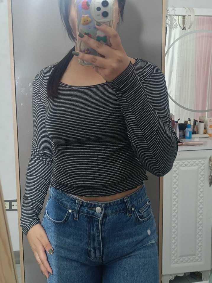 Gri çizgili, uzun kollu ve tekne yaka crop top. Denim görünümlü kumaştan, günlük rahat sokak stili için uygun. ✨ çok giyilmedi