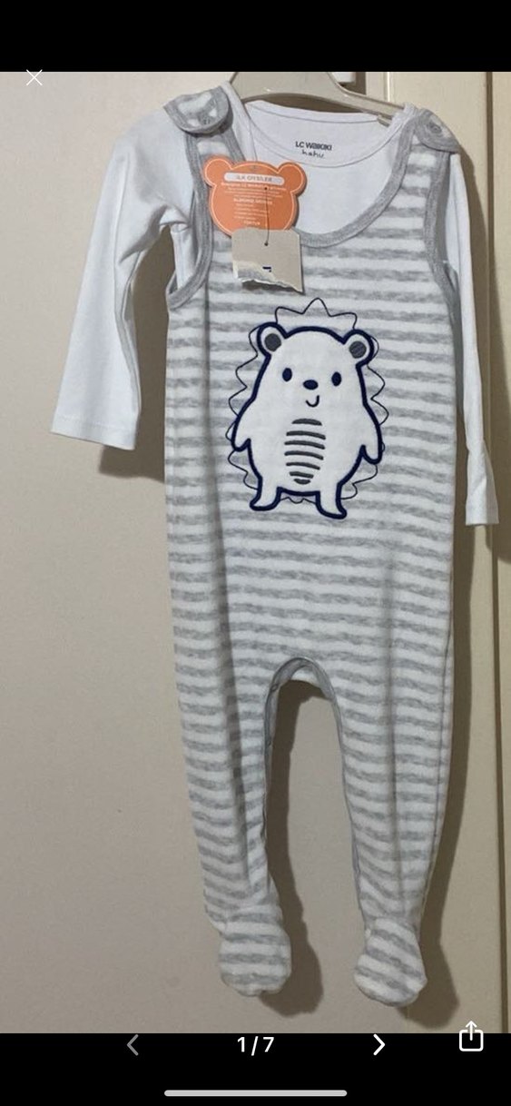 Gri çizgili, uzun kollu ve bisiklet yaka bebek tulumu, örgü dokulu ve sevimli kirpi baskılıdır. Yumuşak ve sıcak kumaştan üretilmiştir.