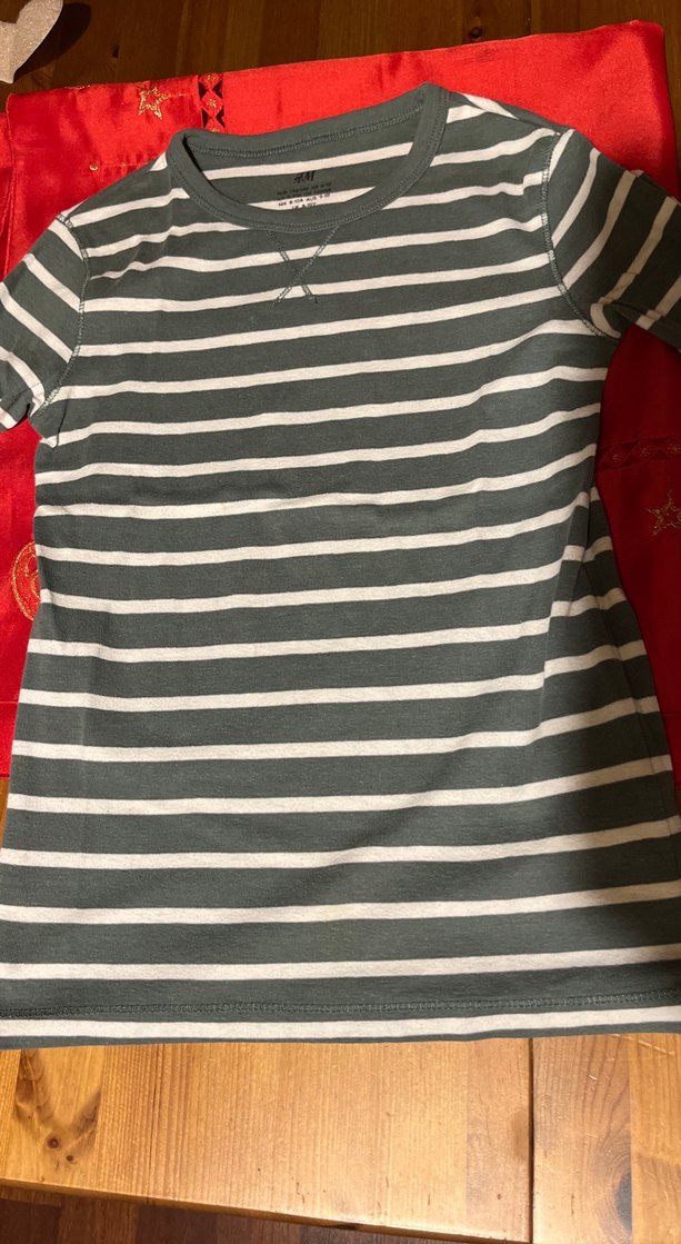 Kısa kollu, yuvarlak yaka ve düğmeli detaylı, ince kumaştan gri beyaz çizgili hamile tişörtü. Günlük rahat kullanıma uygundur.