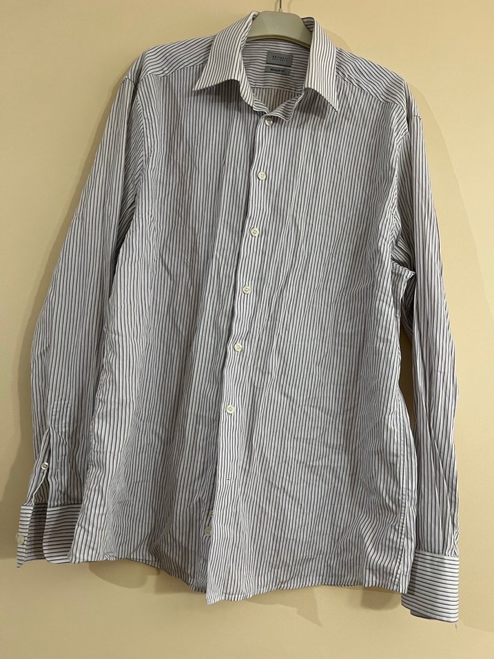 Gri çizgili uzun kollu ve düğmeli manşetli, regular fit erkek gömlek. Ofis ve günlük kullanıma uygundur.