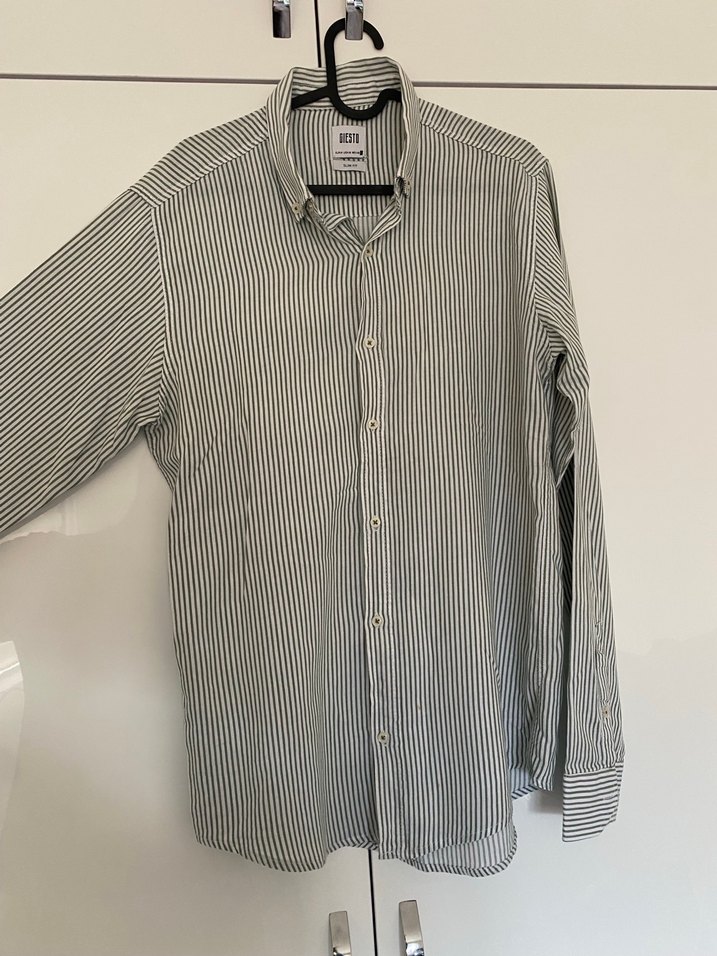 Giesto marka pamuklu temiz Uzun kollu, keten kumaştan yapılmış, düğmeli ve çizgili desenli gri erkek gömleği. Ofis kullanımı için uygun, rahat kesim ve tekne yaka.
