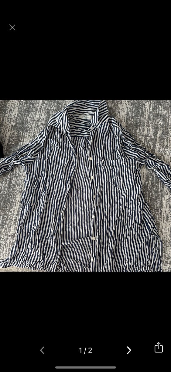 Gevşek kesim, uzun kollu gömlek. Koyu gri çizgili, yakalı ve düğmeli, midi boyda, günlük sokak stili için uygun.