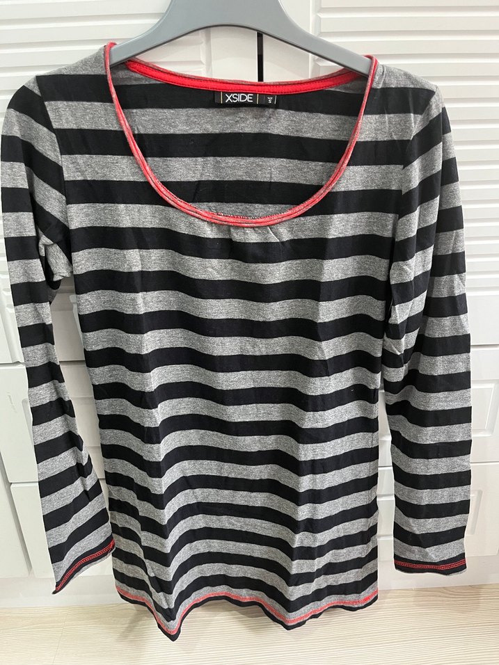 Gri ve siyah çizgili, uzun kollu ve yuvarlak yakalı, vücuda oturan hamile tişörtü. Yumuşak dokulu sentetik kumaştan, günlük sokak stiline uygun. Tunik olarakta kullanılır.