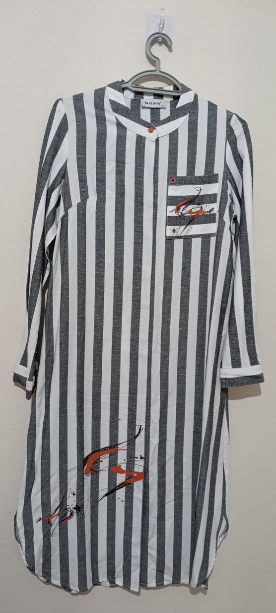 Geniş kesim, uzun kollu, tekne yakalı kadın gömlek. Gri beyaz dikey çizgiler ve baskılı cep detayı bulunur. Rahat sentetik kumaştan üretilmiştir.