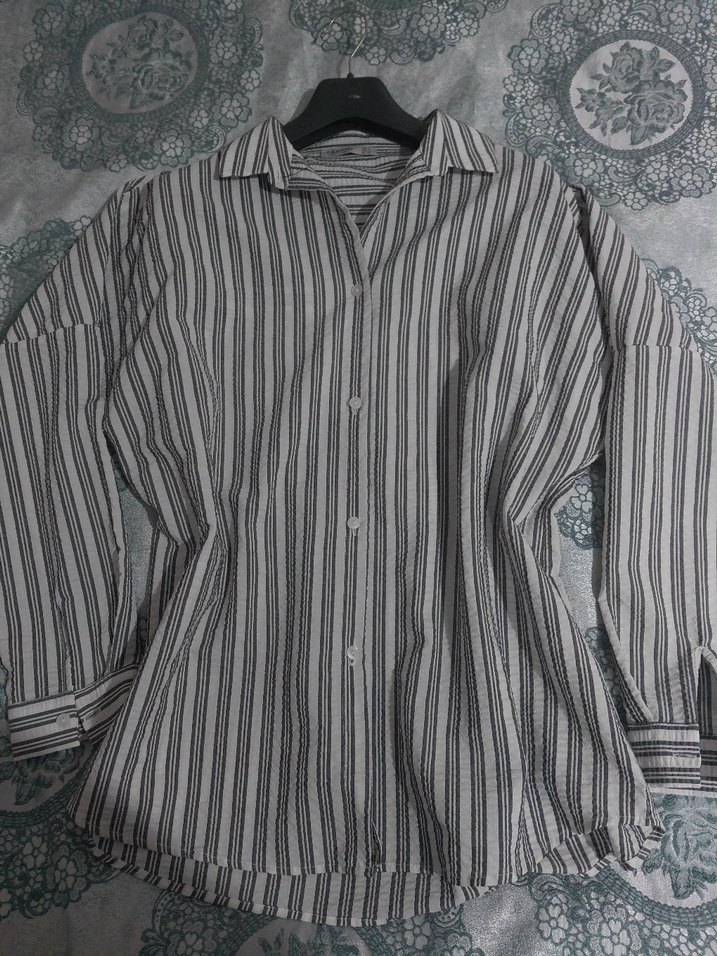 Pazarlık payı vardır. Gri renkli, uzun kollu, yakalı ve düğmeli önü olan, çizgili desenli, rahat kesim kadın gömleği. ️