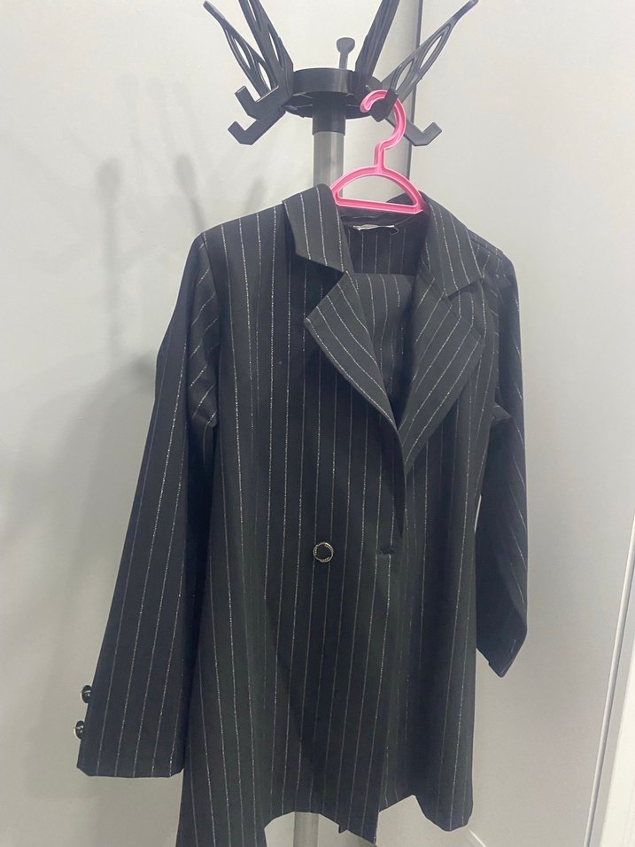 40 ile 46 beden arasında geniş kesim özel dikim Gri çizgili, düğmeli ve uzun kollu kadın takım ceketi, kesimi regular fit ve yakası notched lapel olarak tasarlanmıştır. Ofis için uygun, sokak modası tarzında.
