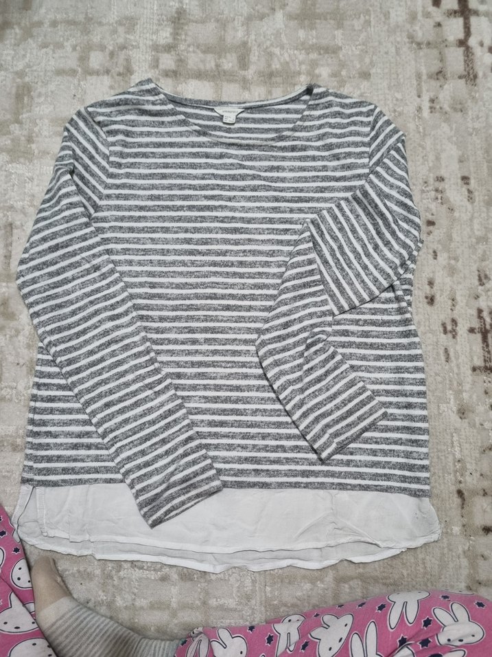Gri çizgili, uzun kollu ve yuvarlak yaka kadın trikosudur. Pamuklu örme kumaştan, bol kesim ve katmanlı etek ucu detayıyla günlük rahat kullanıma uygundur. hic kullanilmadi
