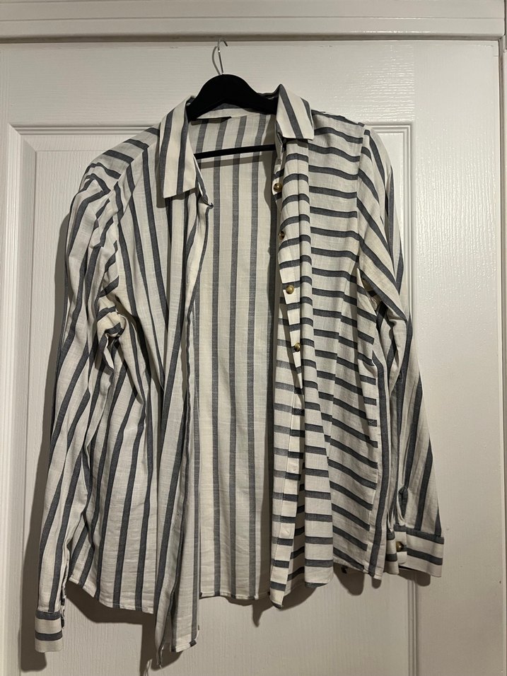 Gri çizgili, keten kumaştan uzun kollu, düğmeli ve yakalı gömlek. Rahat kesimiyle günlük sokak stiline uygundur. 34-44 beden. Unisexte olur. Kadın/erkek