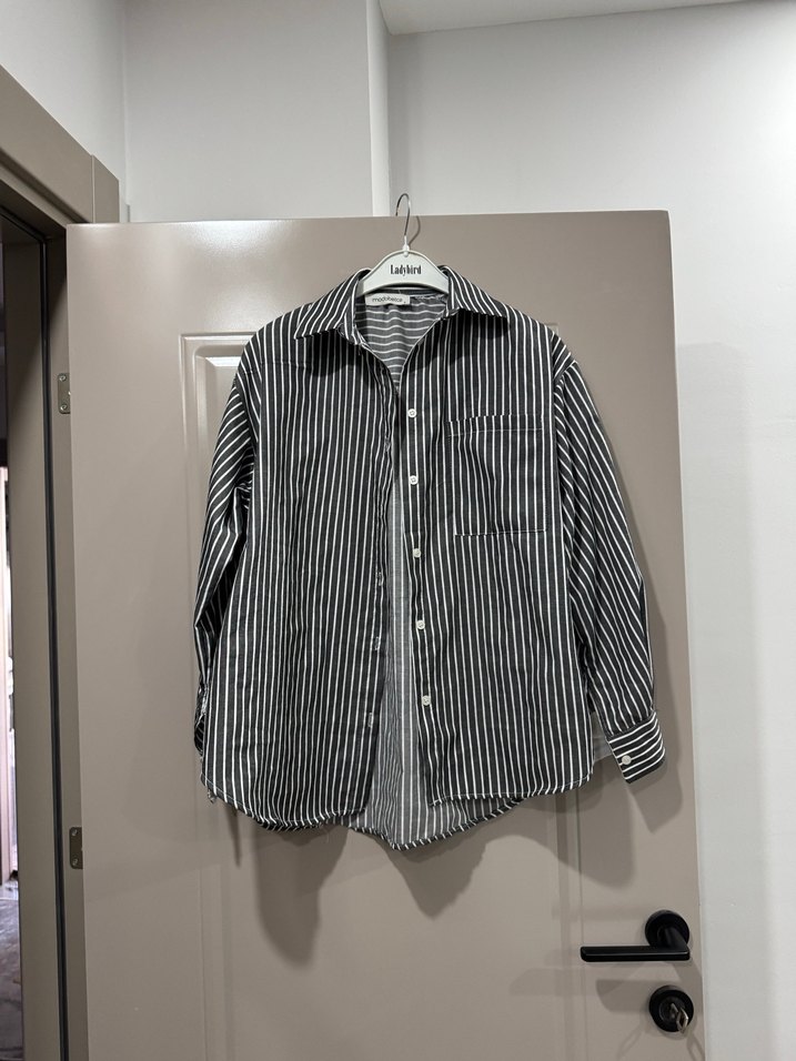Gri Çizgili Uzun Kollu Keten Gömlek