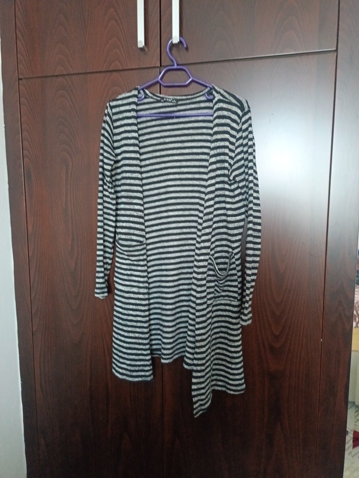 Gri çizgili, uzun kollu, tekne yaka ve bol kesim midi hırka. Örgü görünümlü sentetik kumaştan üretilmiştir, günlük kullanıma uygundur.